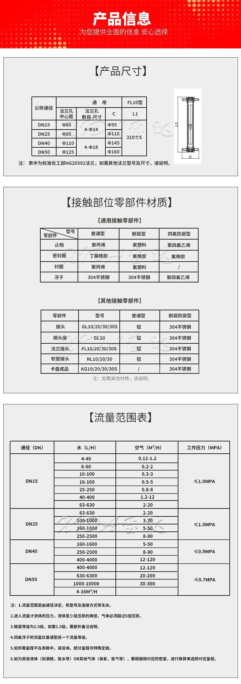 5. 延伸:FL10-15玻璃轉(zhuǎn)子流量計是一款可測普通介質(zhì)的流量計。如需耐腐型流量計,可選擇FL10-15F(接液耐腐)或FL10-15B(整體不銹鋼)或FL10-15FO(襯四氟流量計)。連接方式還有其它選擇:螺紋連接,軟管連接,卡盤連接。