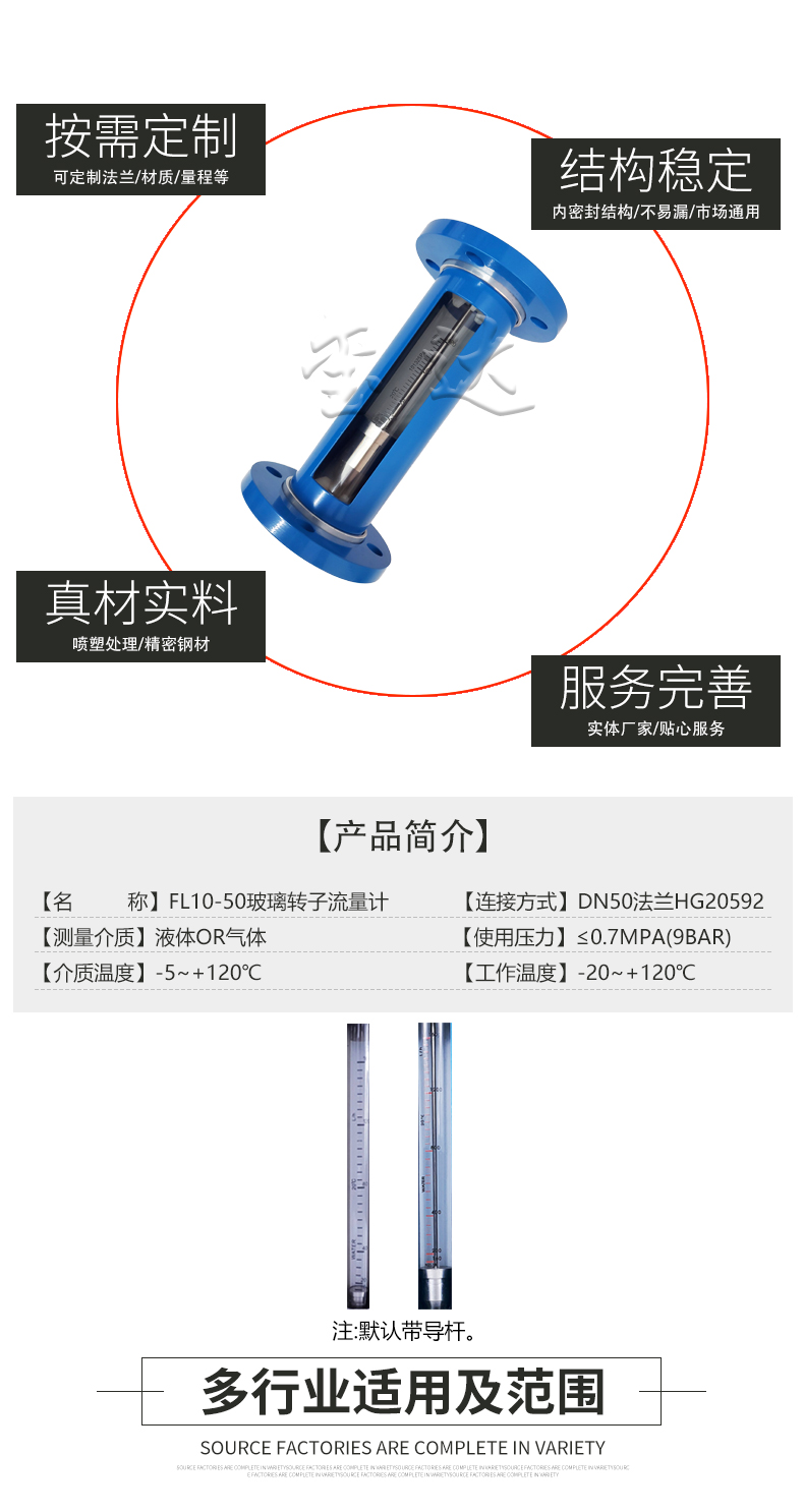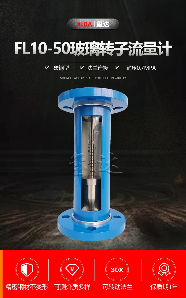 5. 延伸:FL10-50法蘭玻璃轉(zhuǎn)子流量計是一款可測普通介質(zhì)的流量計。如需耐腐型流量計,可選擇耐腐玻璃管轉(zhuǎn)子流量計或不銹鋼玻璃管浮子流量計或PTFE玻璃管轉(zhuǎn)子流量計。連接方式還有其它選擇:螺紋連接,軟管連接,卡盤連接。