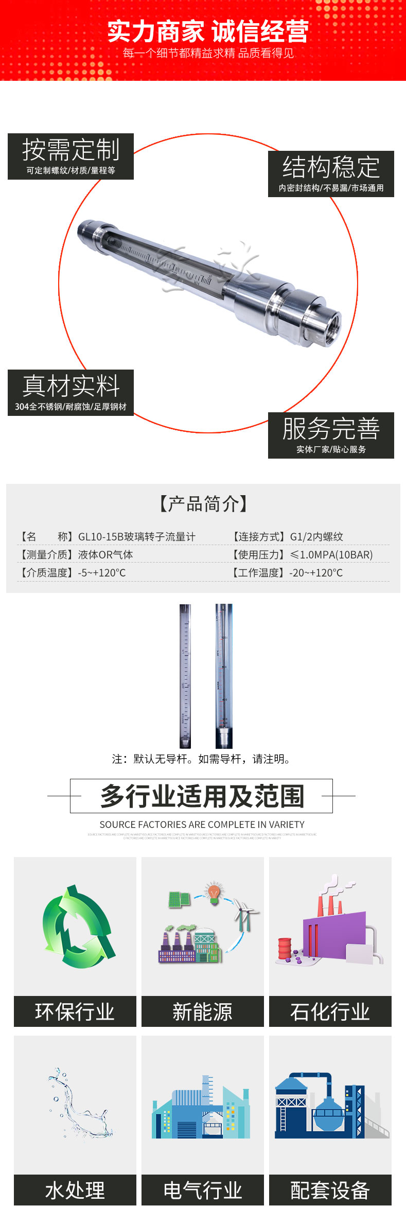 2.特點:此款螺紋型玻璃轉(zhuǎn)子流量計測量瞬間流量,可耐腐蝕,工作壓力可達1.0MPa。