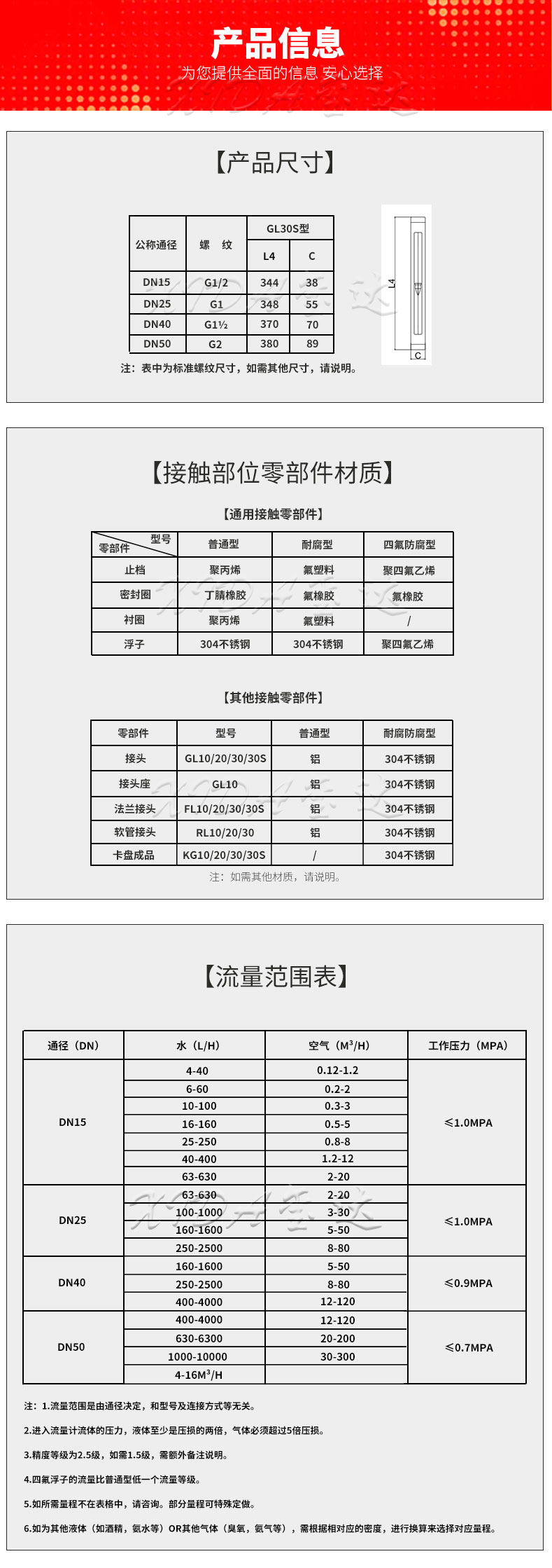 2.特點:GL30S-15螺紋型玻璃轉(zhuǎn)子流量計測量瞬間流量,可耐腐蝕,安裝方便,小巧安全,工作壓力可達(dá)1.0MPa。