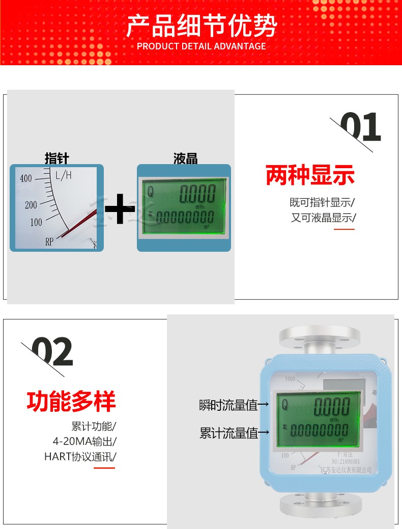浮子內(nèi)嵌一根磁鋼,指示器中有磁耦合系統(tǒng)與之形成磁關(guān)聯(lián),當(dāng)浮子在測量管中上下移動時,指示器中的磁耦合系統(tǒng)會帶動指針移動。利用磁傳感器檢測位移并轉(zhuǎn)換成電信號,經(jīng)電路板處理后顯示瞬時和累計流量,指針在指示盤上指示瞬時流量。