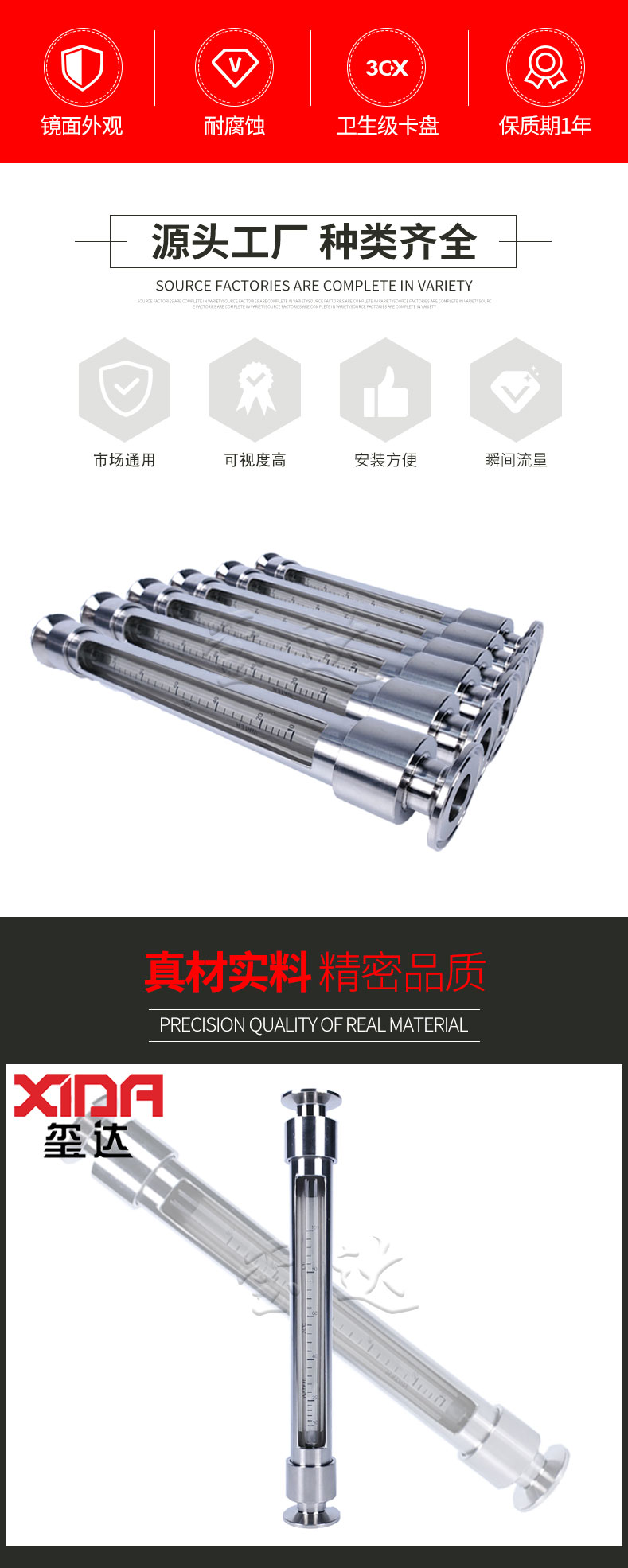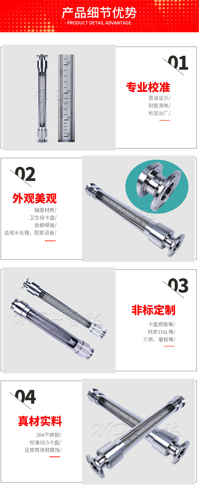 3.外觀:璽達儀表采用304不銹鋼,鏡面材質(zhì),衛(wèi)生級卡盤,魚鱗焊接,適用水處理及配套設備等,真材實料,足厚足料。