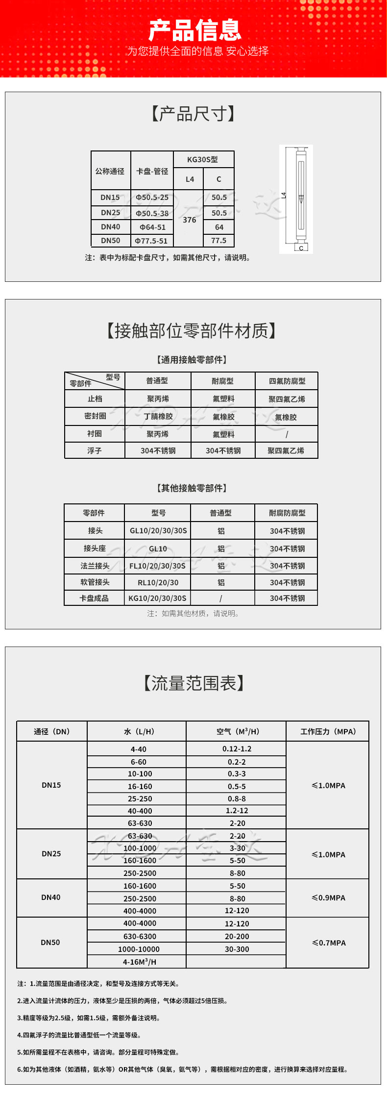 5. 延伸:KG30S-15玻璃轉子流量計是一款通過卡箍固定卡盤的方式進行安裝,安裝在眾多連接方式中方便快捷。此款流量計可以測量有腐蝕性的介質。如需量程更大,可選擇KG30S-25,KG30S-40,KG30S-50。